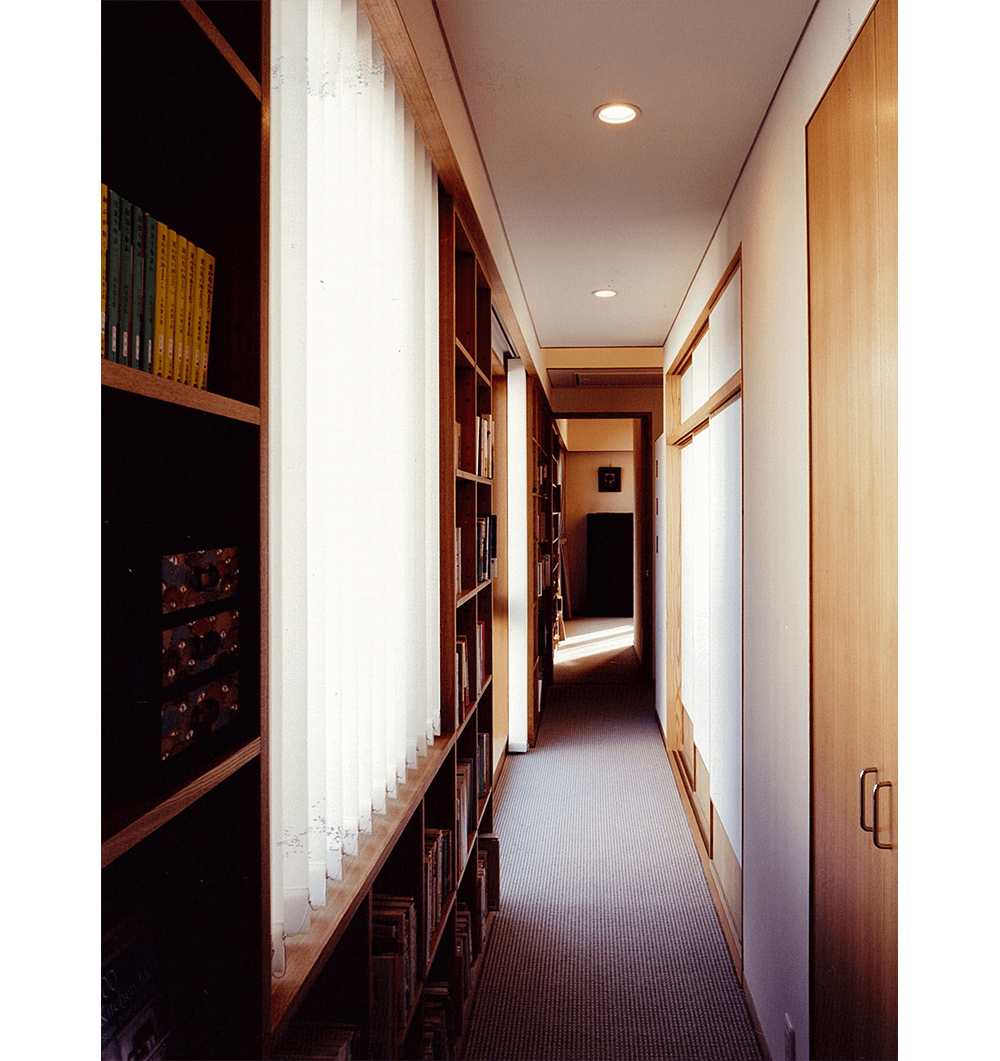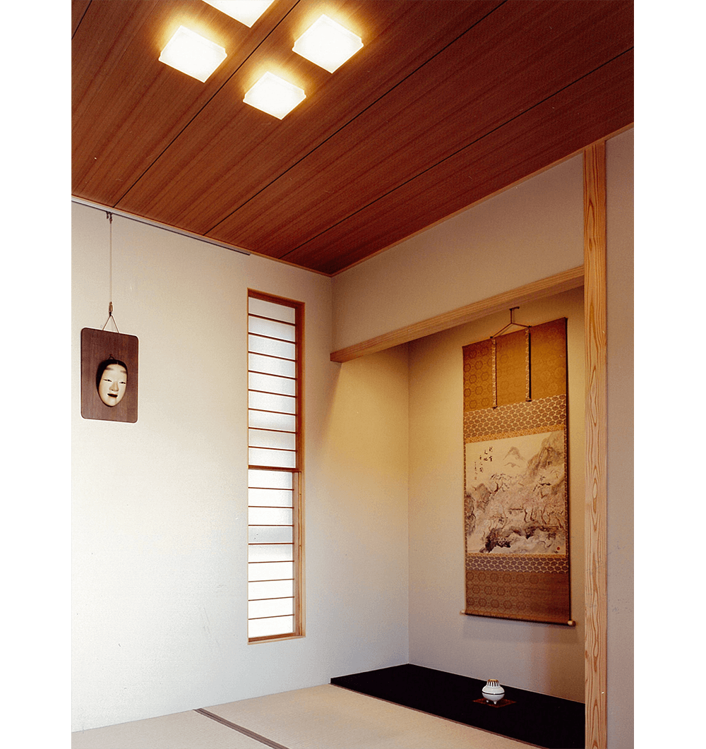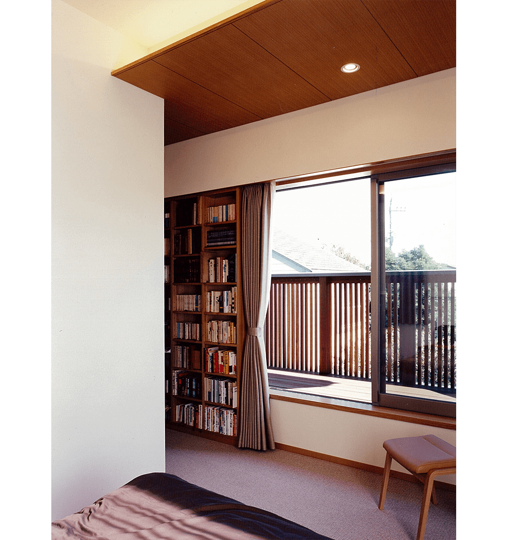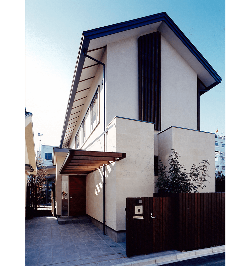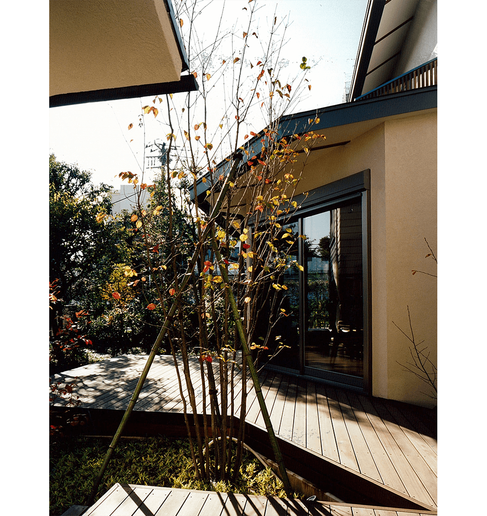 都心に残された数少ない閑静な低層住宅地で、クライアントは、3世代にわたり長年住まわれた既存家屋の改築と庭も含めた敷地全体の利用計画を相談されました。3方向を公園や緑道に囲まれた恵まれた敷地環境は、その分いろいろな方向から眺められ、周辺の植物になじみながらの街並み景観、外観デザインと、プライバシーに配慮した中庭の構成がテーマになりました。新旧建物で囲まれたウッドデッキのコートと、南東につながる庭が適度な開放感とプライバシーを保ち、環境全体が内外に調和するよう配慮しました。各方面からの見え方は多様な表情を持たせ、特に、大きな壁面となる西公園側は、プライバシー保護、西陽除けの機能を果たしながら、屋根と天然木の格子によるシンプルなデザインで駅から来訪する家族やゲストを迎える顔となっています。