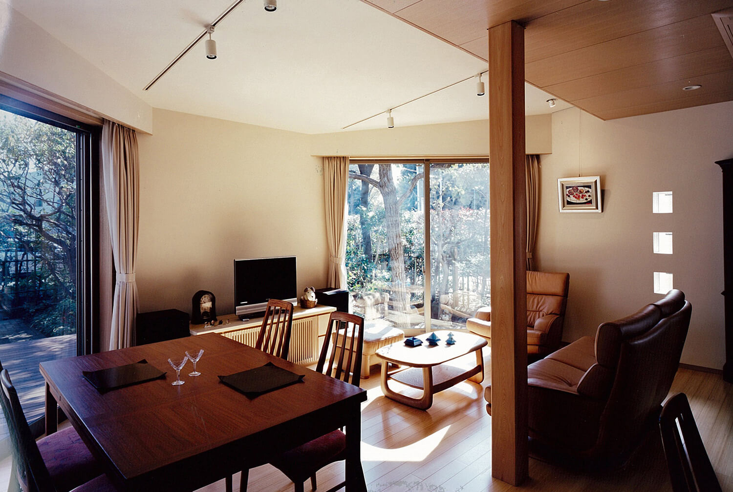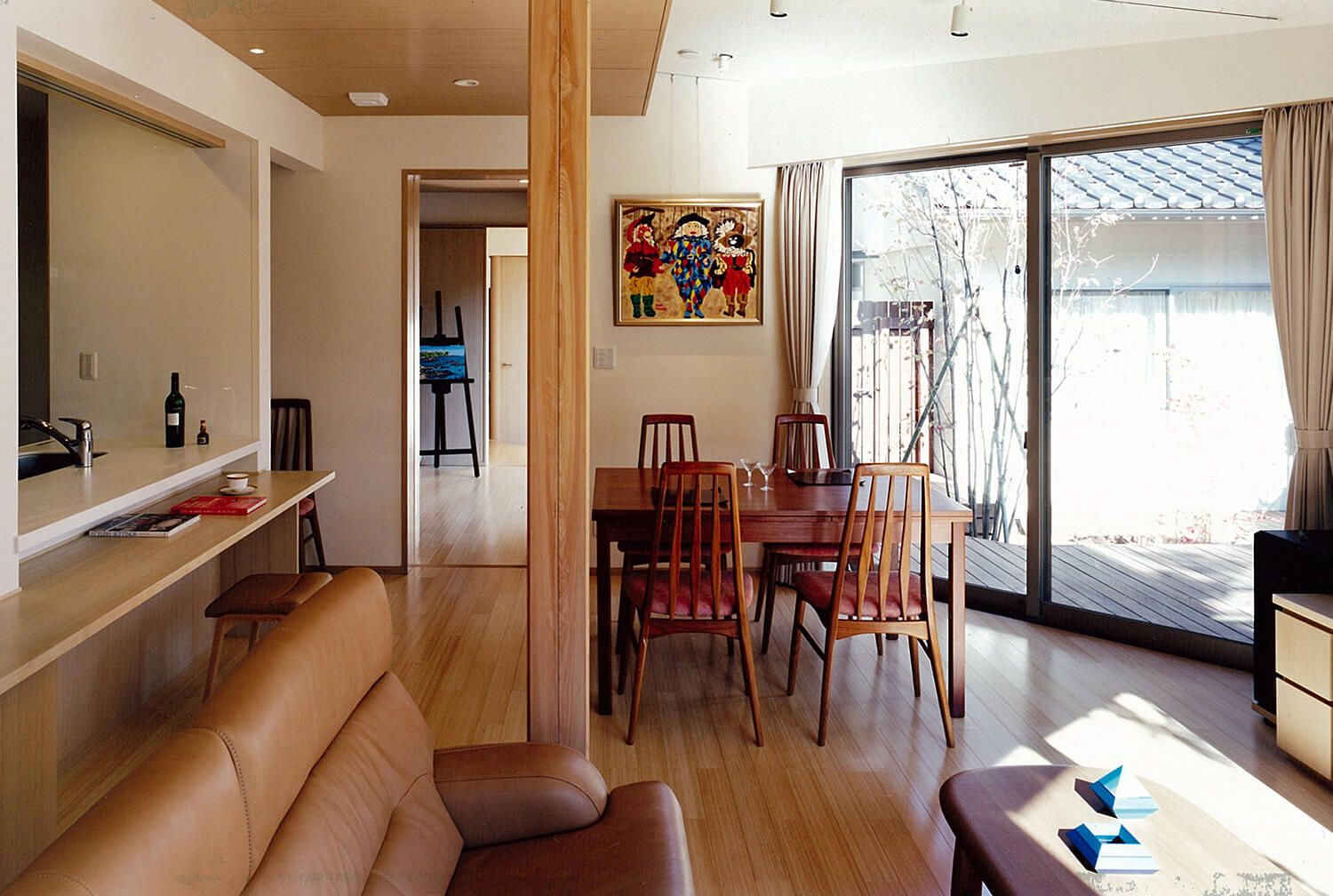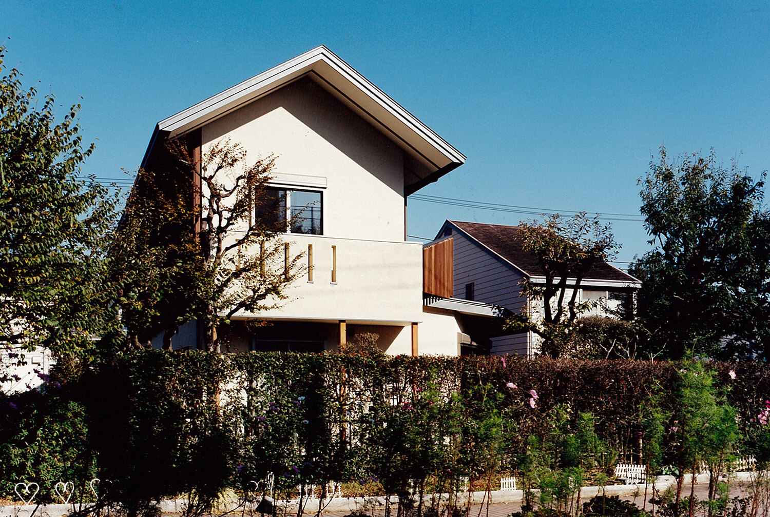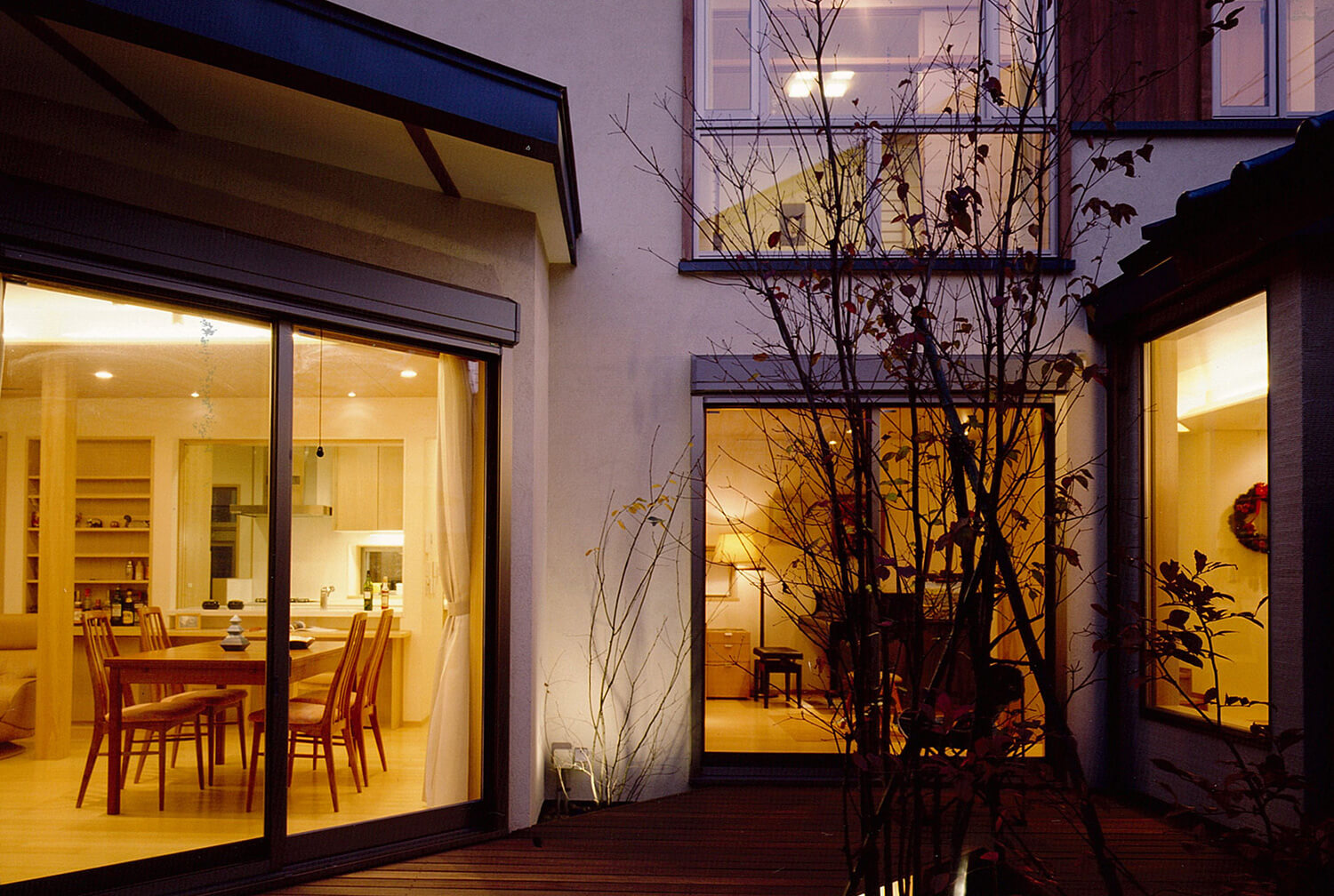 都心に残された数少ない閑静な低層住宅地で、クライアントは、3世代にわたり長年住まわれた既存家屋の改築と庭も含めた敷地全体の利用計画を相談されました。3方向を公園や緑道に囲まれた恵まれた敷地環境は、その分いろいろな方向から眺められ、周辺の植物になじみながらの街並み景観、外観デザインと、プライバシーに配慮した中庭の構成がテーマになりました。新旧建物で囲まれたウッドデッキのコートと、南東につながる庭が適度な開放感とプライバシーを保ち、環境全体が内外に調和するよう配慮しました。各方面からの見え方は多様な表情を持たせ、特に、大きな壁面となる西公園側は、プライバシー保護、西陽除けの機能を果たしながら、屋根と天然木の格子によるシンプルなデザインで駅から来訪する家族やゲストを迎える顔となっています。