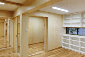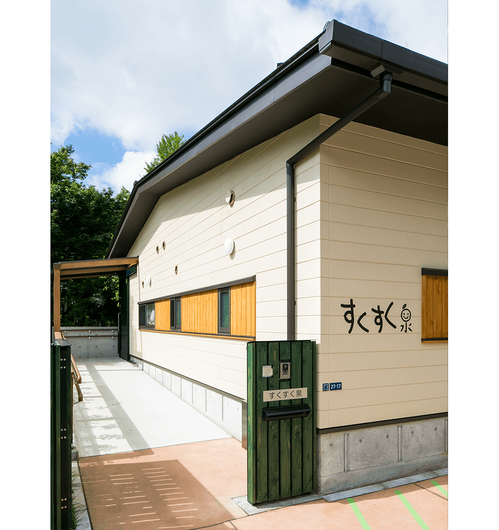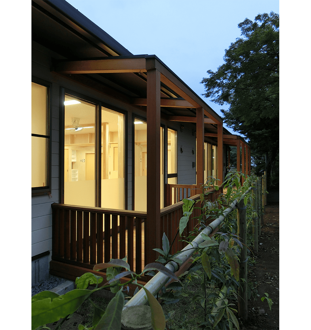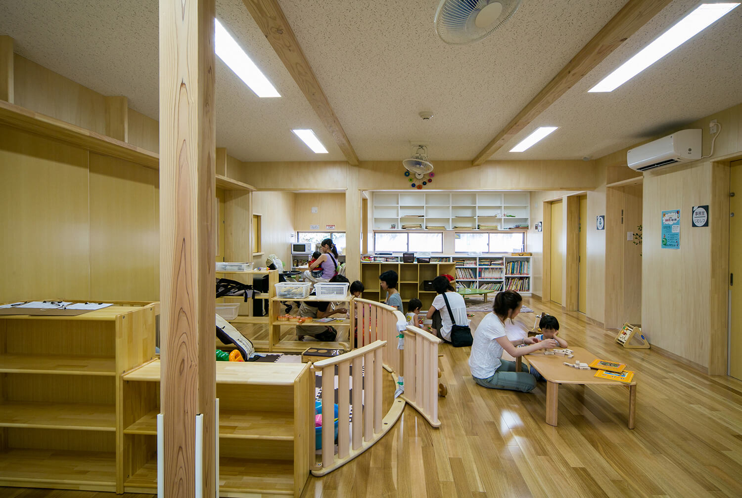 保育機能とひろば機能を複合させた武蔵野市の子育て支援施設として、井之頭小学校に隣接する旧私立泉幼稚園跡地の一部に計画され、指名プロポーザルにて特定されました。建物はシンプルな長方形平面の中に各室を有機的に配置し、低い庇によるヒューマンな道路景観を創出しました。跡地の大部分は公園となり地域に開放されるため、公園側にも門扉を設け、天然木のウッドデッキで内外をつなげ、一体的利用が可能な計画としました。子育て支援施設として、木のぬくもりを感じられる仕上・壁や家具等の角を丸める・扉の指詰め防止・”ささくれ”しにくい天然木ウッドデッキなど、子どもにやさしく、安全・安心に利用できる施設となるよう配慮しました。
