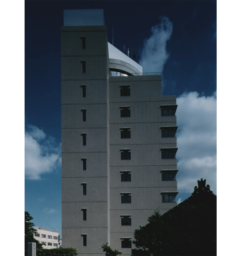 駅前商業地に建つ、ホール、オフィス、店舗の複合ビル。エントランス広場、サンクンガーデン(地下広場)外装材の工夫などにより、ヒューマンでアイデンティティのある都市空間の演出や景観に配慮した。内部空間は合理的で快適なインテリアを目指した。