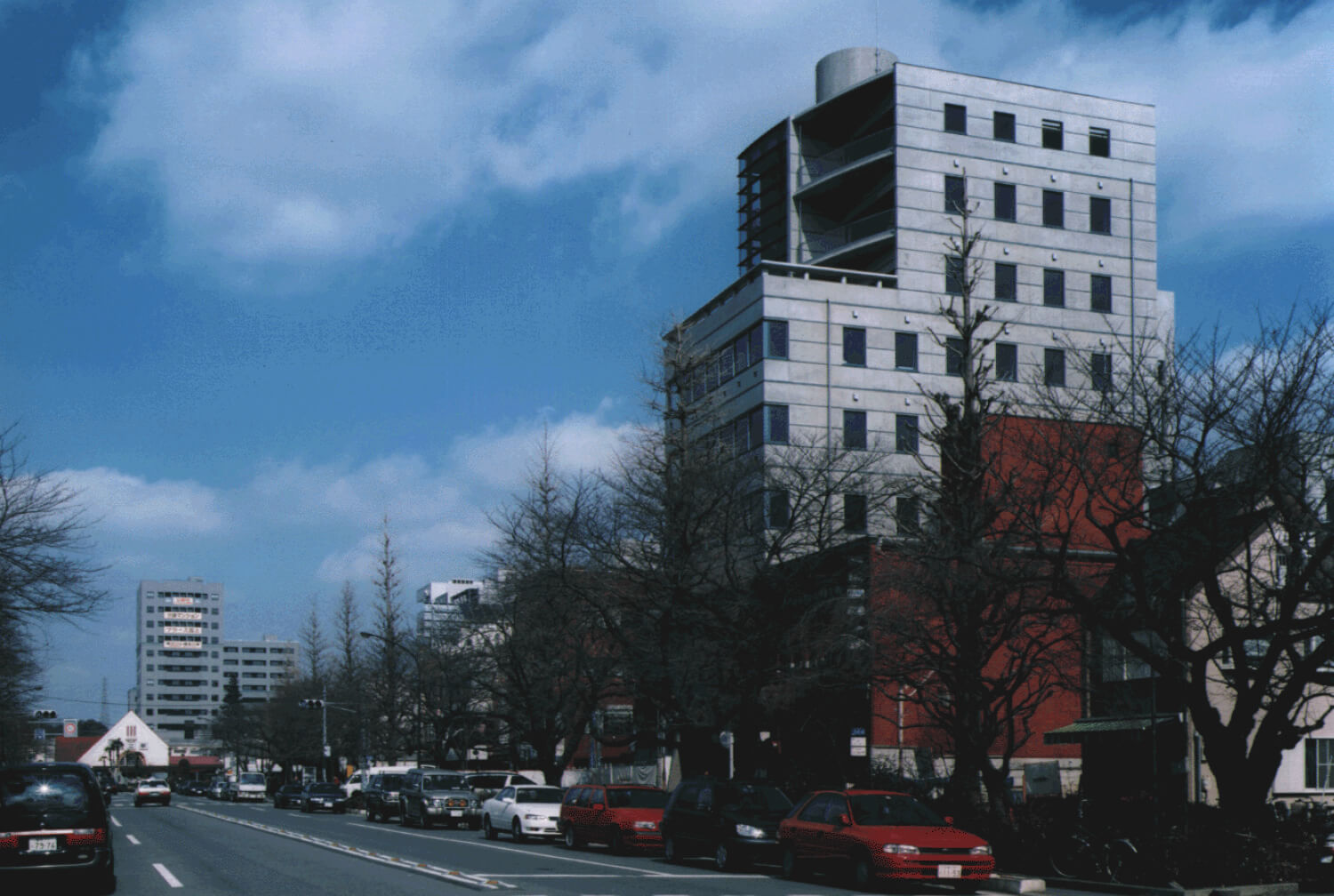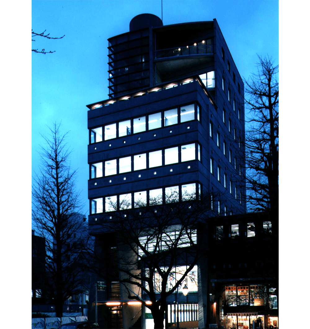 国立駅前大学通りに面する複合テナントビル。上層階をセットバックし、コンクリート打放しと石ボーダーの外壁、ガラスと金属のファサードデザインなど都市景観を重視しながら、アイデンティティ豊かな建築をめざした。低層部店舗は、大学通 りになじませ、上層部オフィスはOA化に対応した、快適で質の高い仕様としている。